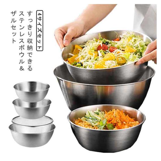 ボウル 下ごしらえ ざる 下ごしらえ セット ボール 4点セット 目盛り付き ザル付き ステンレス ステンレスボウル 丸ざる 調理器具 キッチン用品 キッチンツール ギフト プレゼント お菓子作り 新生活 一人暮らし