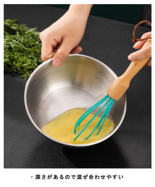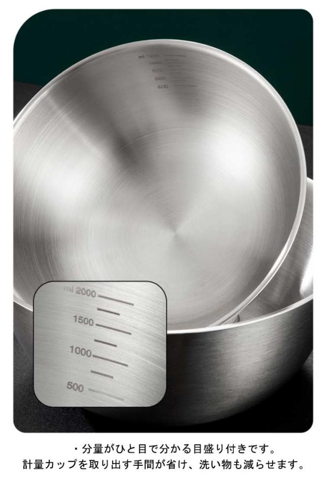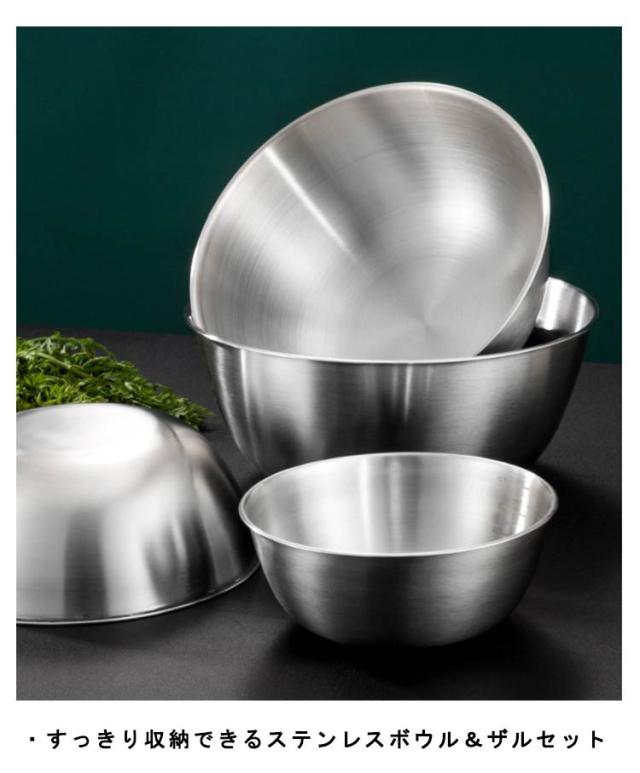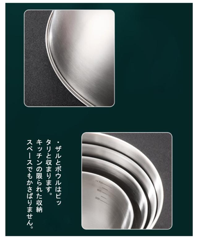 | ・すっきり収納できるステンレスボウル&ザルセット ・深さがあるので混ぜ合わせやすい ・分量がひと目で分かる目盛り付きです。計量カップを取り出す手間が省け、洗い物も減らせます。 ・ザルとボウルはピッタリと収まります。キッチンの限られた収納スペースでもかさばりません。 | |