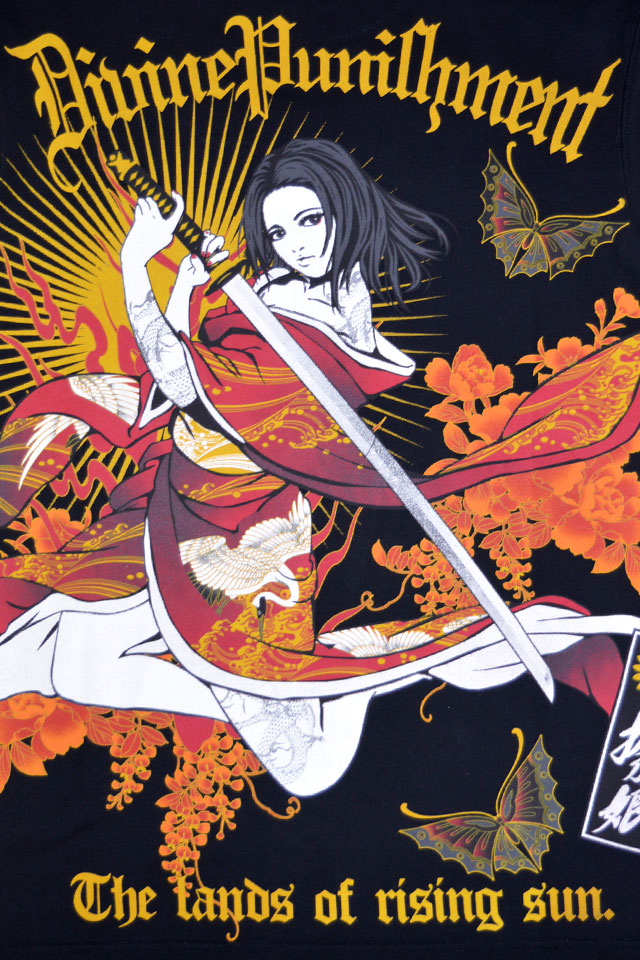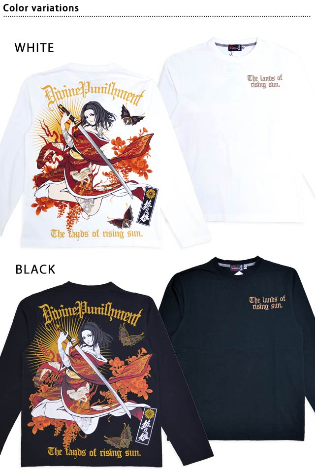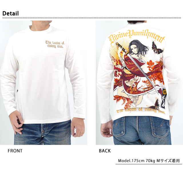 絡繰魂の姉妹ブランドとして誕生した、従来の和柄から抜け出し、和の持つ美しさを融合させた【抜刀娘】から「抜刀娘 凛 一刀流ロングTシャツ(251133)」のご紹介です。 今回モチーフの主役に採用されたのは、美しい凛。 背中には刀を構えた凛の姿をダイナミックにプリントしました。 着物や帯の柄まで拘るのが抜刀娘流。 肌蹴た肩や腿には刺青が彫り込まれています。 バックにしっかり柄を入れている分、フロントはシンプルにデザインし、メリハリを付けました。 左胸にはレタードをワンポイントで刺繍しました。 ボディーには、綿100%のさらりとした柔らかなTシャツ生地を使用。 | |||||||||||||||||||||||||