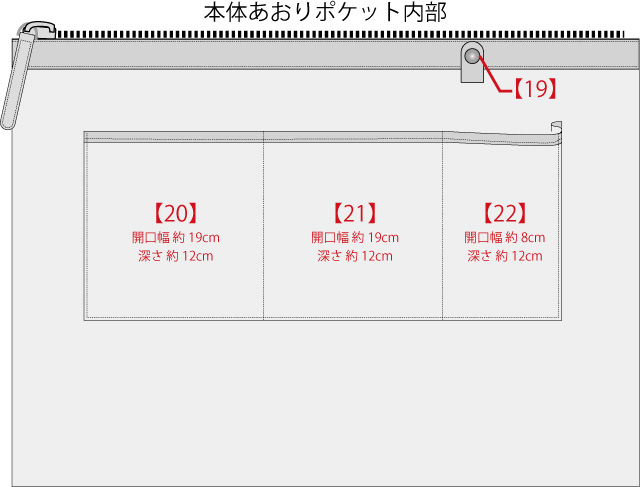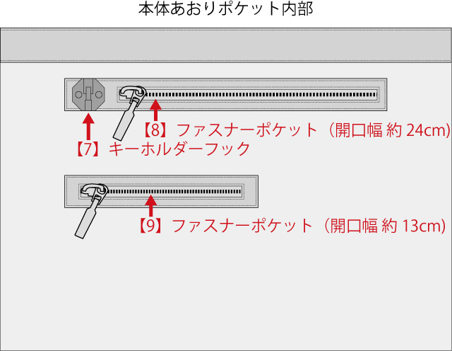 | 収納 | [内側] ファスナーポケット×3、オープンポケットx11 ペットボトルホルダー、ケーブルベルト、キーホルダーフック、カスパ取付用ホック×3 |