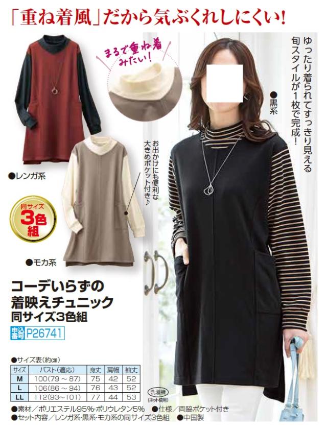 コーデいらずの着映えチュニック 3色組 重ね着風 チュニック ハイネック 長袖 レディース 婦人服 ミセス シニア 女性 黒 ブラック レンガ色 モカ ベージュ ボーダー 無地 シンプル カジュアル ファッション 40代 50代 60代 70代 80代 母の日 お母さん 秋冬 fri p26741