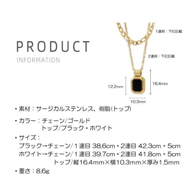 | サイズ | 【チェーン】 ホワイト:1重目→長さ:39.7cm 2重目→41.8cm+5cm(共用アジャスター) ブラック:1重目→長さ:38.6cm 2重目→42.3cm+5cm(共用アジャスター) 【トップ】縦:16.4mm × 横:10.3mm × 厚み:1.5mm |