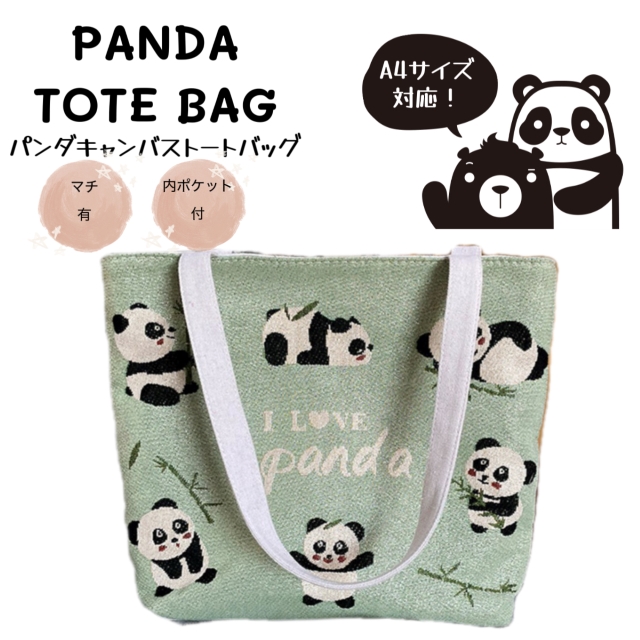 パンダの刺繍が可愛いキャンバストートバッグ、内ポケット付きで大容量。