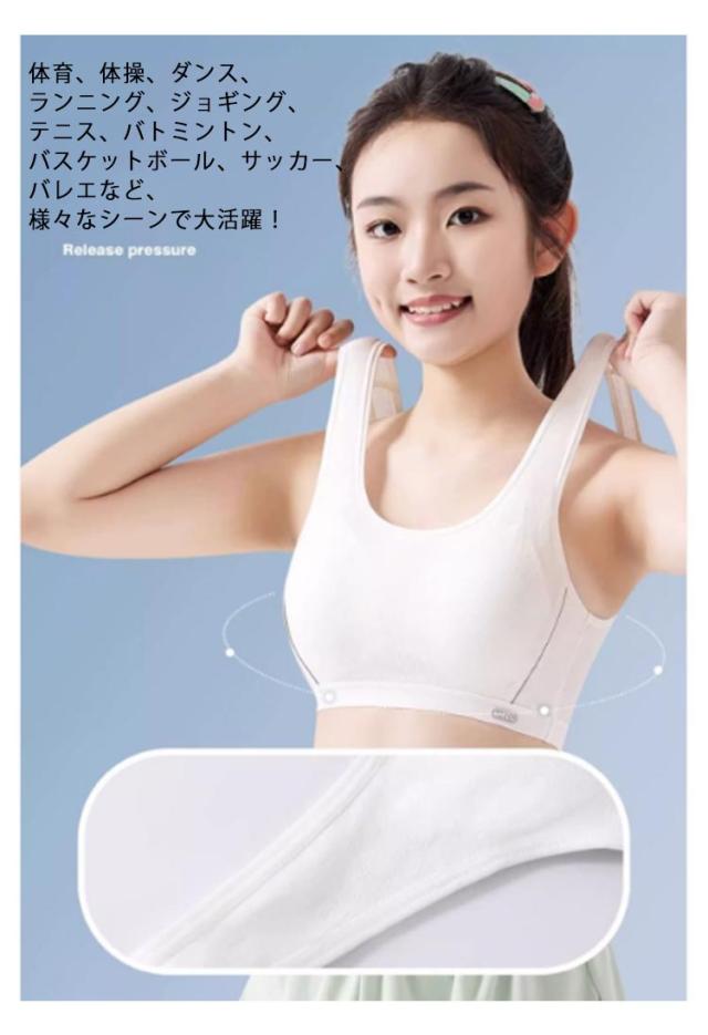 | 小学生・中学生の運動シーンを応援するブラジャー。 ノンワイヤーの伸縮素材でしっかりサポートし、バストの揺れを防ぐスポーツブラ。 軽くて柔らかい、伸縮性に優れ、型崩れしにくい、どの形のバストにもぴったりフィット! 体育、体操、ダンス、ランニング、ジョギング、テニス、バトミントン、バスケットボール、サッカー、バレエなど、様々なシーンで大活躍! | |