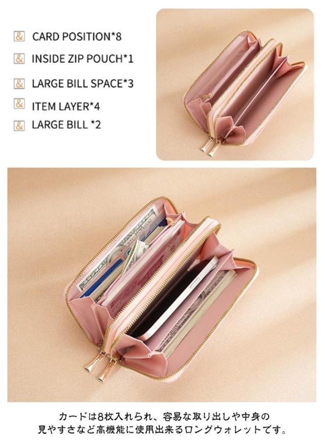 | 大きく開く・多機能財布 ●高級レザーで作られたレディース財布です。落ち着いた色でビジネスでもカジュアルでもきちんとした服装でも合わせやすいです。 ●ダブル開閉のファスナー仕様になり、口を大きく広げられるので出し入れも楽々です。 ●カードは8枚入れられ、容易な取り出しや中身の見やすさなど高機能に使用出来るロングウォレットです。 | |