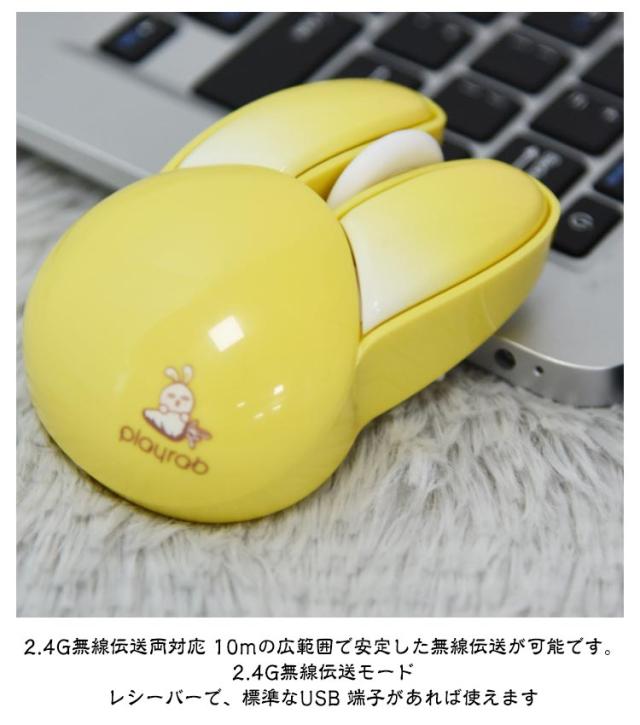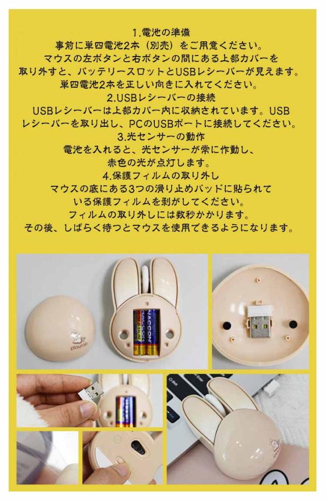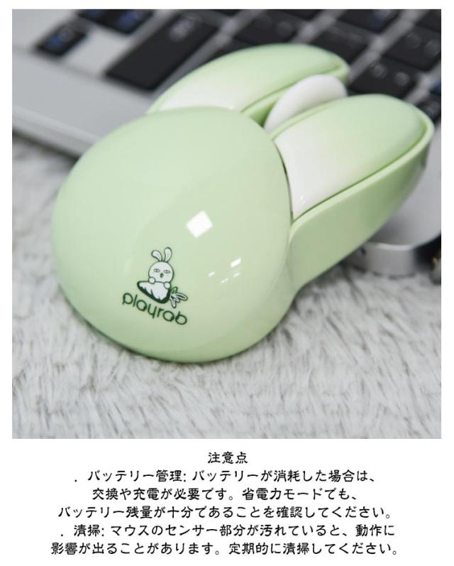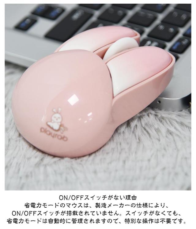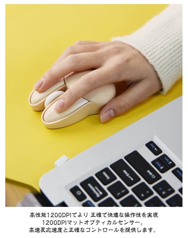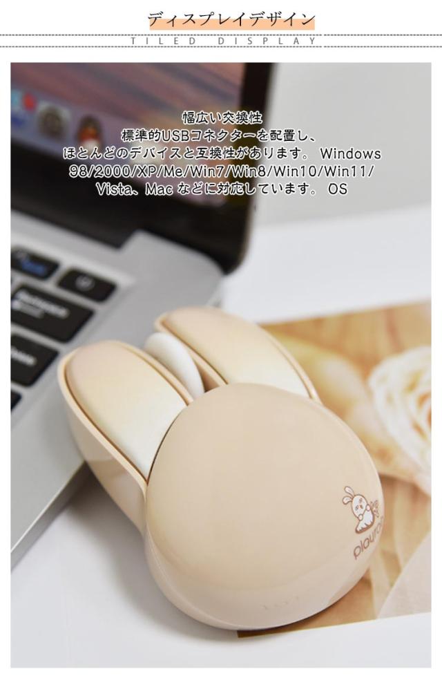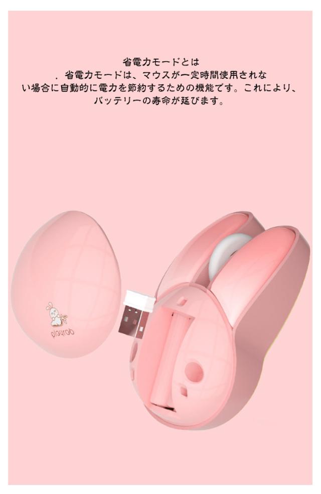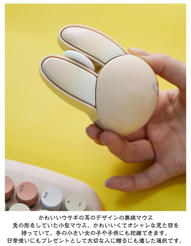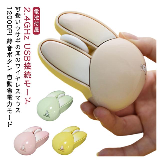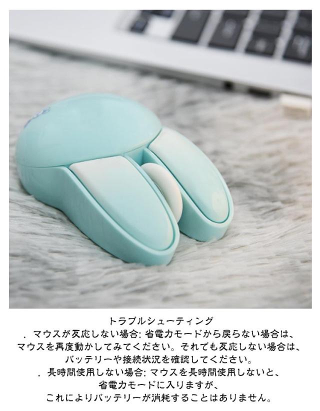 | 可愛いウサギの耳のワイヤレスマウス 2.4GHz USB接続モード 1200DPI 静音ボタン 自動省電力モード 【電池付属】 <お勧めポイント> ●ポイント1 かわいいウサギの耳のデザインの無線マウス 兎の形をしていた小型マウス、かわいいくてオシャレな見た目を持っていて、手の小さい女の子や子供にも把握できます。 日常使いにもプレゼントとして大切な人に贈るにも適した選択です。 ●ポイント2 幅広い交換性 標準的USBコネクターを配置し、ほとんどのデバイスと互換性があります。 Windows 98/2000/XP/Me/Win7/Win8/Win10/Win11/Vista、Mac などに対応しています。 OS ●ポイント3 カチカチしない 静音マウス オフィスや静かな環境でも他人の迷惑になりません。 カチカチというクリック音が気になりにくいです。 マウスのクリック音が気になってしまい、作業に集中できない方におすすめです。 ●ポイント4 2.4G無線伝送両対応 10mの広範囲で安定した無線伝送が可能です。 ・2.4G無線伝送モード レシーバーで、標準なUSB 端子があれば使えます ●ポイント5 高性能1200DPIでより 正確で快適な操作性を実現 1200DPIマットオプティカルセンサー。 高速反応速度と正確なコントロールを提供します。 ●ポイント6 人間工学に基づいた形状で 手首の疲労を軽減 人間工学に考えれた曲線的な薄型デザイン、手の型に 合わせて握りやすく、手首や腕への負担も軽減します。 また、外側は厳しい摩耗、摩擦、及び 高温テスト強化された特殊コーティングを備えて、 耐汗、滑り止め、指紋防止も。 ●ポイント7 電池式&自動省電力モード 5分間何も操作しないと電力を節約するために自動的に スリープ状態になり、軽く動かすと再びアクティブになります。 アルカリ単四形乾電池2本で駆動。(ご注意:製品には電池が含まれていません。) ●ポイント8 コンパクトサイズ 軽量、携帯便利 94×62×36mmのコンパクトサイズ、重さはわずか82gでかばんに入れでも邪魔にならず、外出先でも気軽に利用できます。 1.電池の準備 事前に単四電池2本(別売)をご用意ください。マウスの左ボタンと右ボタンの間にある上部カバーを取り外すと、バッテリースロットとUSBレシー | |