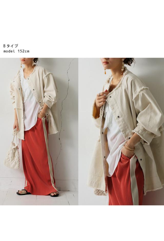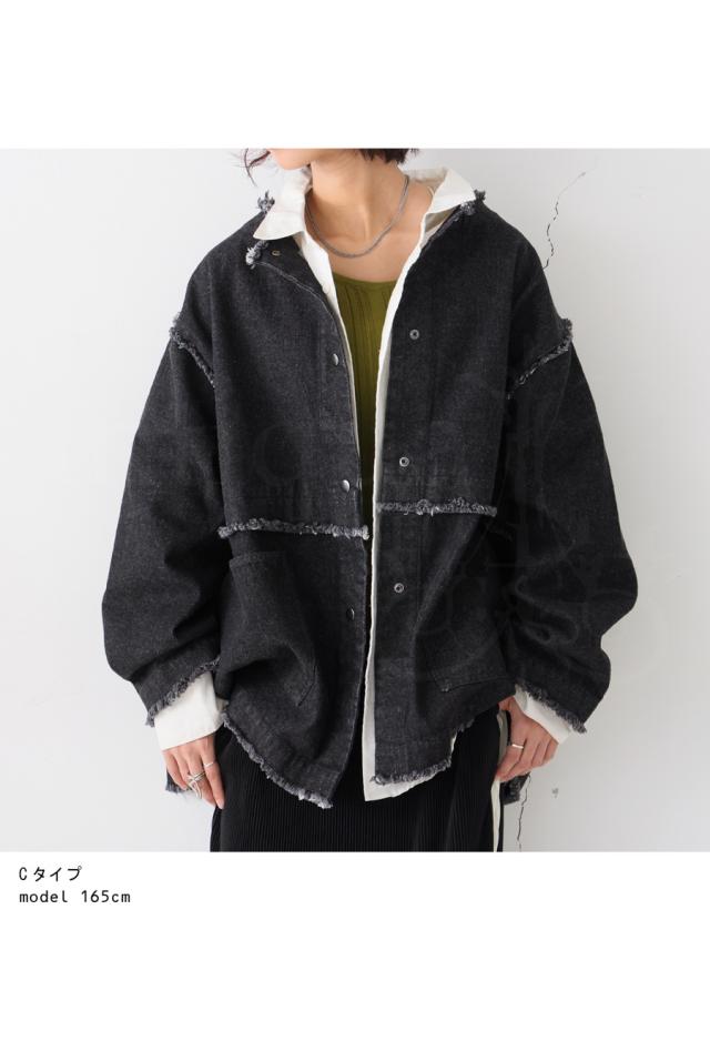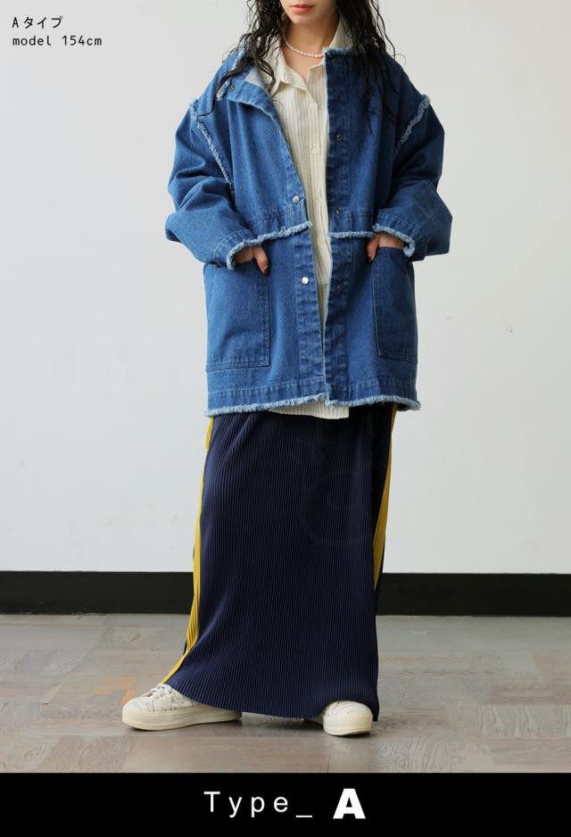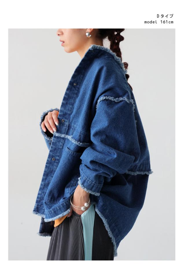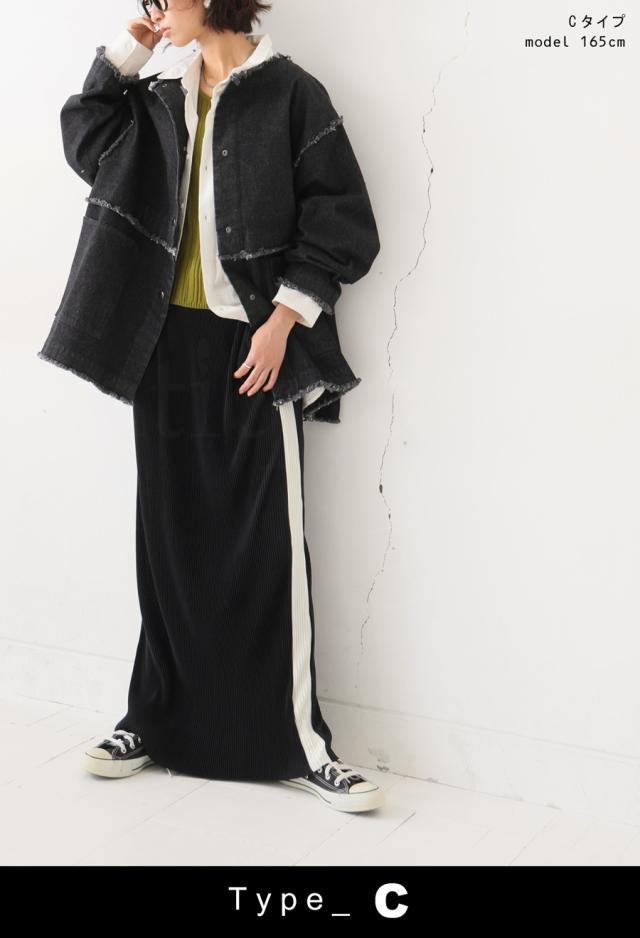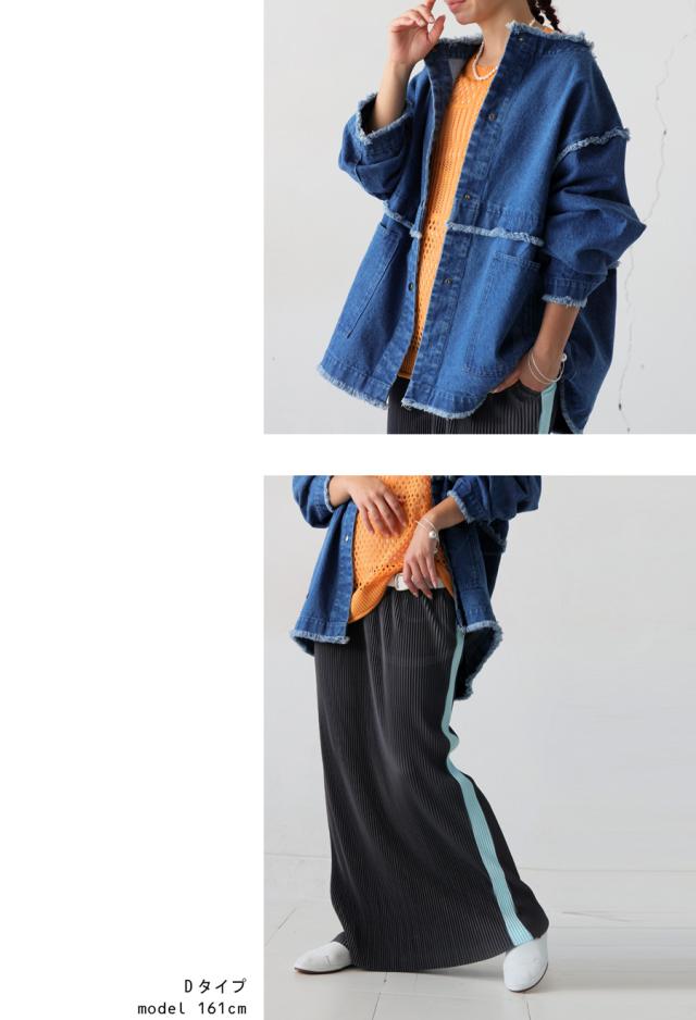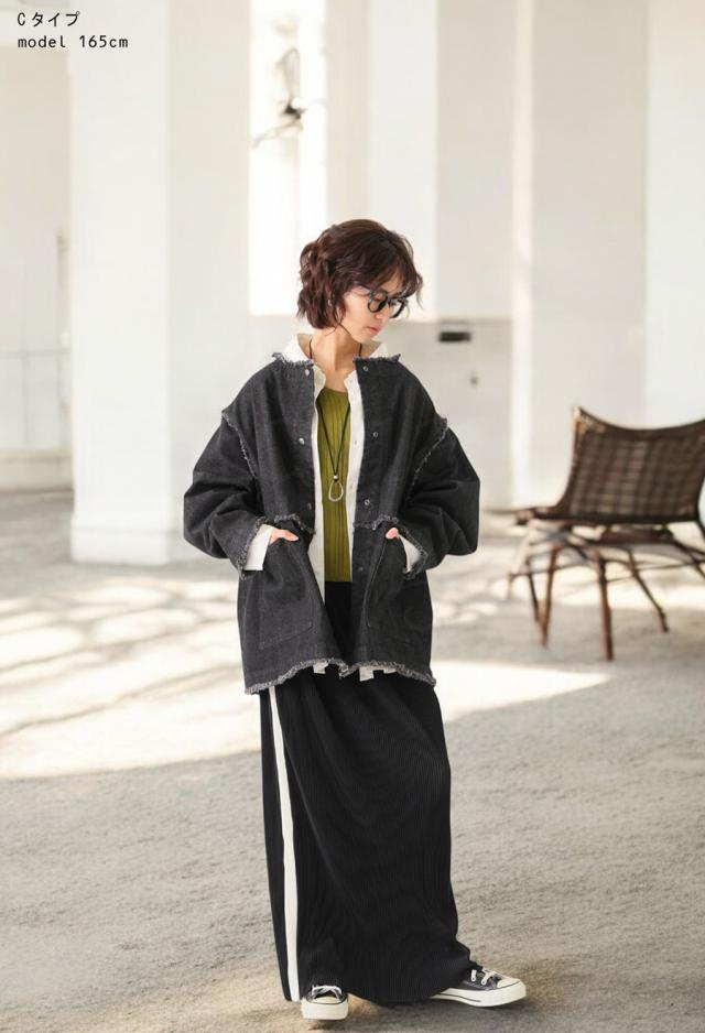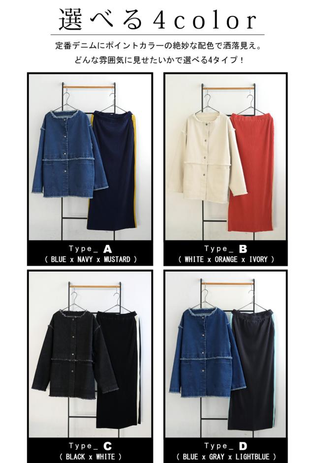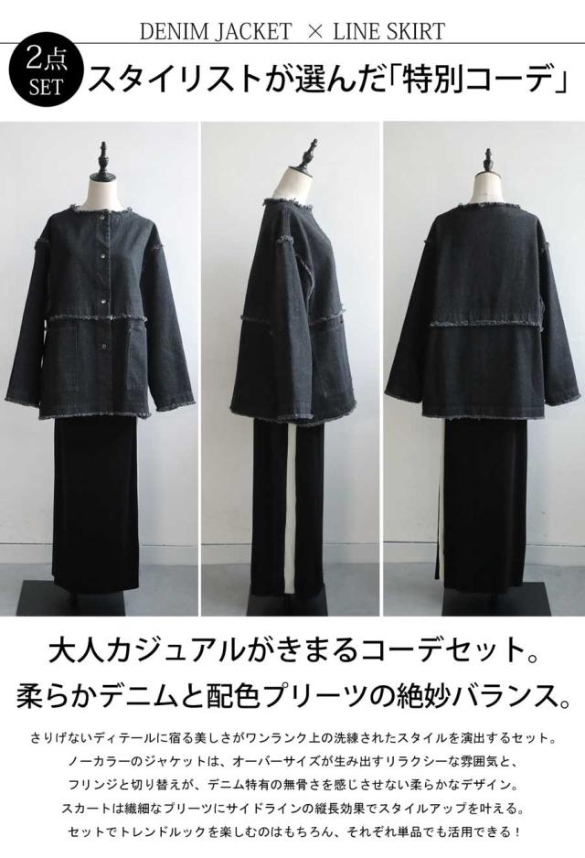 code-00031 アウター ボトムス 上下セット デニム ジャケット ノーカラー 丸首 長袖 フリンジ 切り替え 前開き スカート 配色 ゆったり シンプル 古着風 体型カバー 着痩せ 大きめ