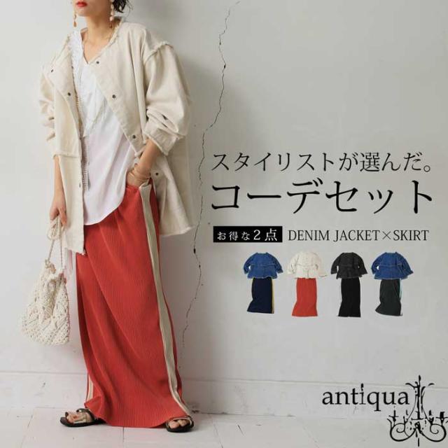 【検索ワード】デニムジャケット ラインスカート レディース アウター ボトムス 上下セット デニム ジャケット ノーカラー 丸首 長袖 フリンジ 切り替え 切りっぱなし 前開き ボタン スカート ライン 配色 バイカラー プリーツ リブ ウエストゴム ポケット付き ゆったり シンプル ヴィンテージ感 古着風 体型カバー 細見え 着痩せ 大きめ 大きいサイズ 特別コーデ 2点セット antiqua アンティカ 大人 おしゃれ 10代 20代 30代 40代 50代 60代 春 夏 秋 冬 オールシーズン お洒落 カジュアル かわいい かっこいい あんてぃか