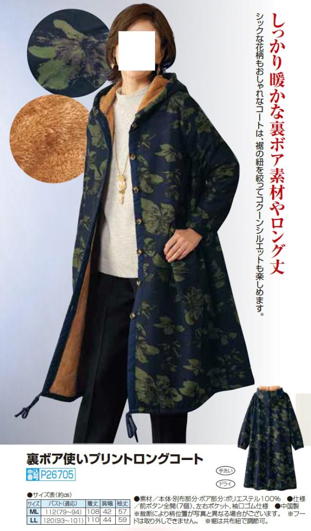 裏ボア使いプリントロングコート 花柄 コート アウター フード付き 長め丈 レディース 婦人服 ミセス シニア 女性 濃紺 フーディー ロングパーカー カジュアル フーデットコート ファッション 40代 50代 60代 70代 80代 母の日 お母さん おばあちゃん 秋冬 nss p26705