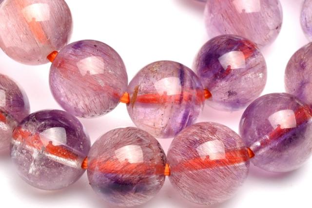 | 特徴・意味 | 細い繊維状のゲーサイトやレピドクロサイトが濃密に内包された華やかなピンク色の可愛らしいスーパーセブンです。 非常に高品質なので水晶の透明度も高く、内包物をじっくり観察することができます。 アメジストのパープルも随所に入り、春の花々のような華やかさがあります。 ここまで統一のサイズとカラーで作られるブレスレットは稀です。 パワーストーンの定番アメジストに、細かなゲーサイトやレピドクロサイトが入っているアメジストスーパーセブンです。 スーパーセブンとは、水晶にアメジスト・スモーキークォーツ・カコクセナイト・ルチルクオーツ・ゲーサイト・レピドクロサイトなどが内包された鉱物の通称名です。 肉眼で7種類の鉱物を全て確認できる事は非常にまれですが、7つの鉱物が内包された状態の原石をカットし、加工した石もスーパーセブンと呼ばれます。 |