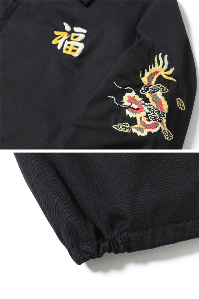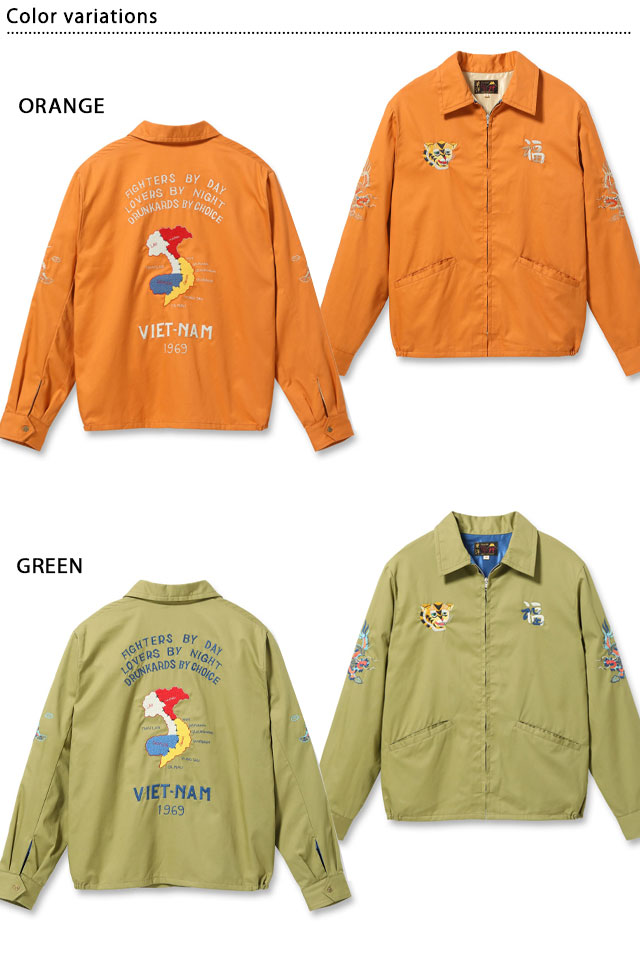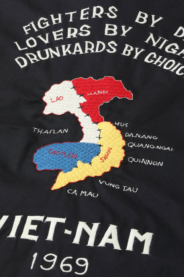 探求心と情熱を持って、上質なアイテムを製作し続けている「テーラー東洋」から、Late 1960s Style コットンベトナムジャケット「VIETNAM MAP」(TT15684)のご紹介です。 1969年にベトナムへ駐留していた米兵がカスタムオーダーで仕立て、アメリカへと持ち帰った一着を再現しました。 ベトナムマップをメインのモチーフとした王道的なデザインですが、それぞれの刺繍には特徴があります。 胸のタイガーヘッドは他と比べてシャープな図案。 「福」の文字が二色の色糸で描かれているところも非常に珍しいポイントです。 背中の地図の中央にはクロスの刺繍が施されており、これも他のベトナムマップ柄には見られない仕様。 背面上部のメッセージは途中で途切れているのですが、それもヴィンテージに基づいて再現しています。 ブラックに加え、ヴィンテージでもレアなグリーンとオレンジの三色展開です。 戦後の日本で誕生したスカジャン同様、1960年代から1970年代のベトナム戦争時に生まれたスーベニアジャケットが、通称ベトジャン。 コットンツイル、もしくはカモフラージュ柄のポンチョライナーの二種類の生地が主に使われ、マットな太めの色糸で絵柄が刺繍されています。 | |||||||||||||||||||||||||