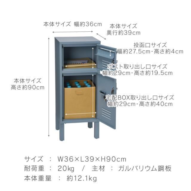 本体サイズ:W36cm×L39cm×H90cm 本体重量:約12.1kg 投函口サイズ:W27.5cm×H4cm ポスト取出口サイズ:W29cm×H19.5cm 宅配ボックス取出口サイズ:W29cm×H40cm |