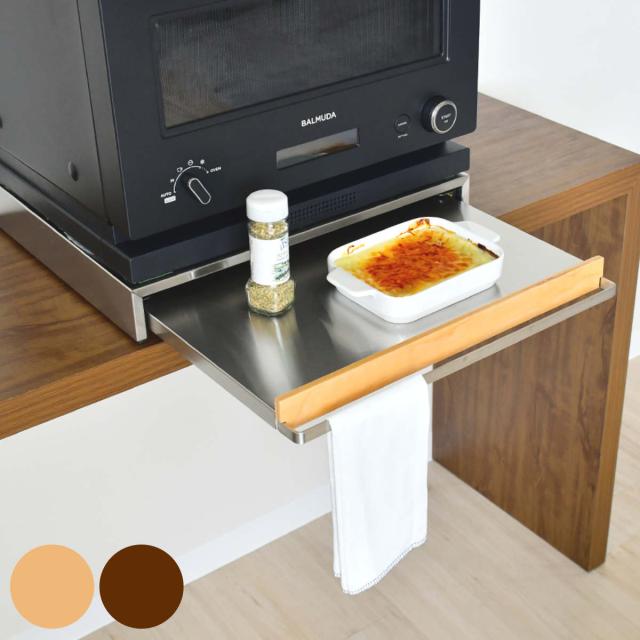 サビに強くお手入れのしやすいステンレス製のオーブンレンジラックです。前面板に南魚沼産木材を使い、木目のあたたかみをプラスした、キッチンに馴染みやすいデザインです。引き出し式のスライドテーブルで、調理器具やお皿をちょっと置きできる作業スペースを確保できます。