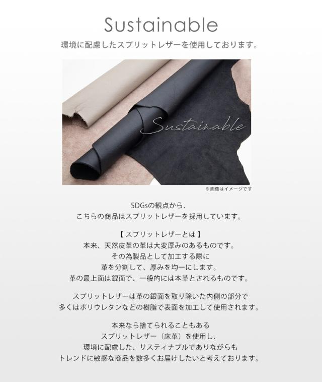 | その他 | 製造工程の関係上、各採寸箇所実寸より【約-3cm〜+3cm】程度は 誤差の許容範囲とさせて頂いております。予めご了承ください。 環境に配慮したスプリットレザーを使用しています。 スプリットレザーとは 革の最上面の銀面を取り除いた内側の部分に ポリウレタンなどの樹脂で表面を加工して使用されるレザーです。 本来なら捨てられることもある スプリットレザー(床革)を使用し、 サスティナブルでありながらも トレンドに敏感な商品を数多くお届けしたいと考えております。 商品写真はできる限り実物の色に近づけるよう徹底しておりますが、撮影時期や照明、またお使いのモニター設定、お部屋の照明等により実際の商品と色味が異なる場合がございます。予めご了承ください。 |