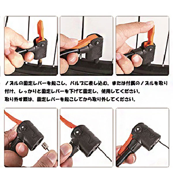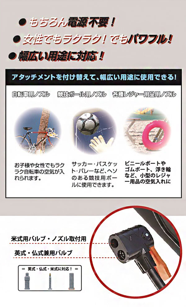 ・米式・英式・仏式のすべての自転車の空気入れに対応