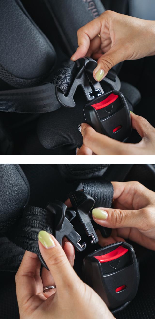 手前側に倒れやすいバックル形状と、タングが沈み込まない設計で、お子さまをラクに乗せることができます。
