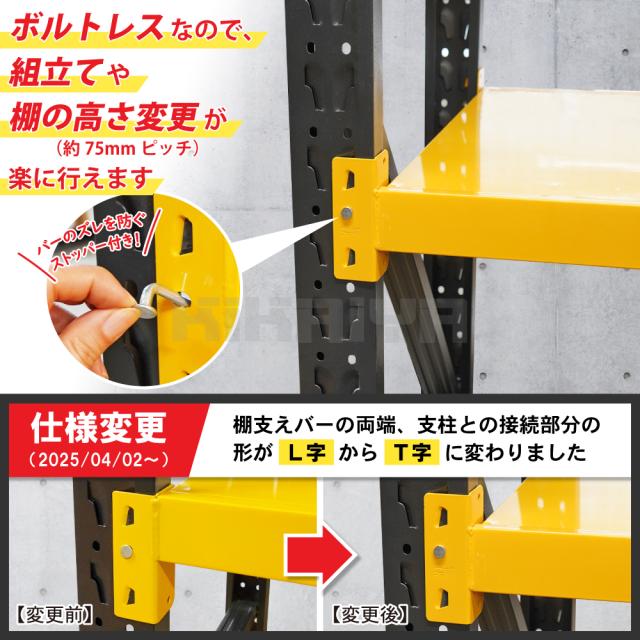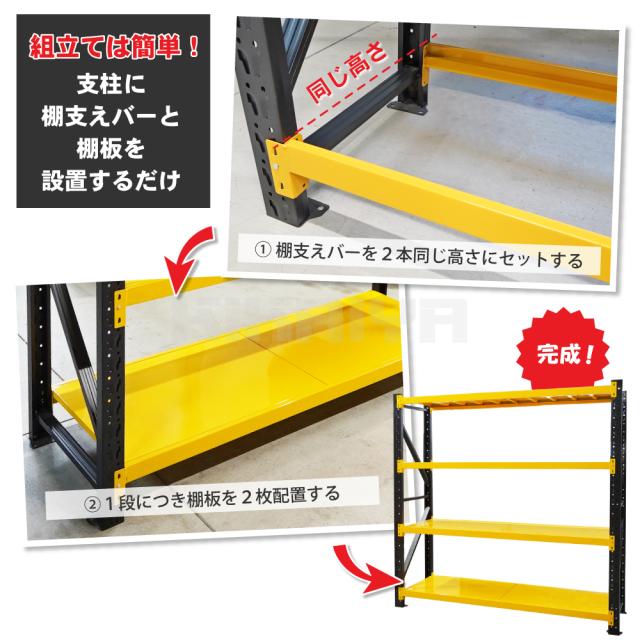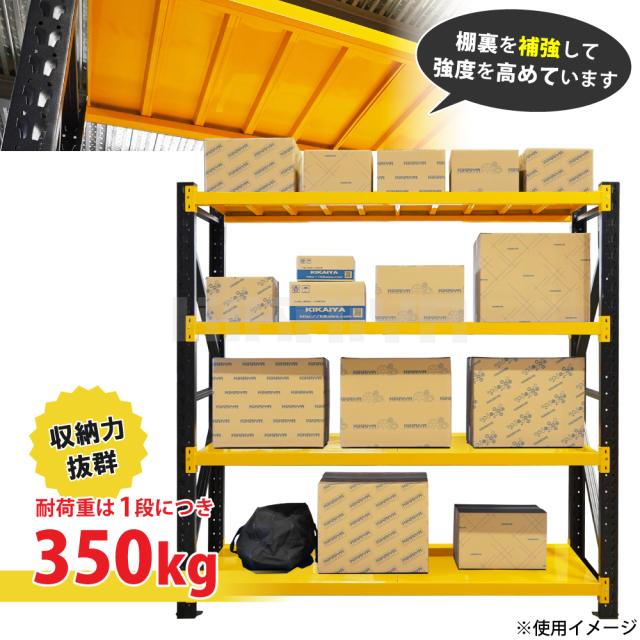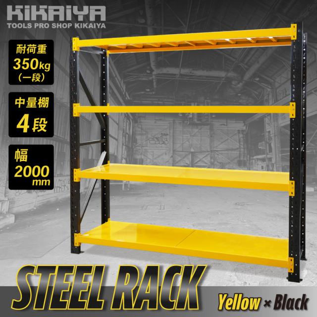 スチールラック 4段 ボルトレス イエロー×ブラック ワイド幅 業務用 収納棚 中量棚 メタルラック 耐久性あり 350kg 頑丈 高強度 幅200×奥行60×高さ200cm KIKAIYA