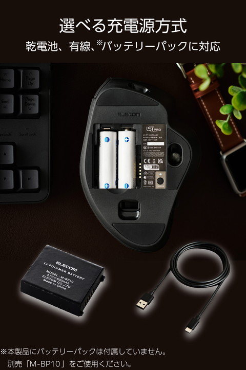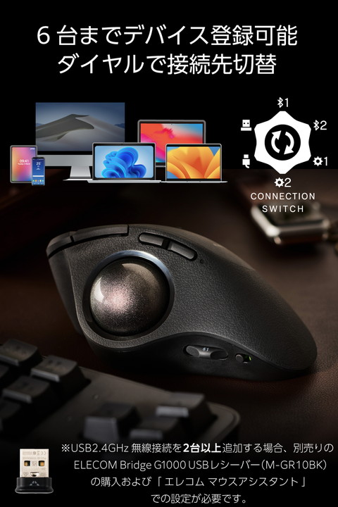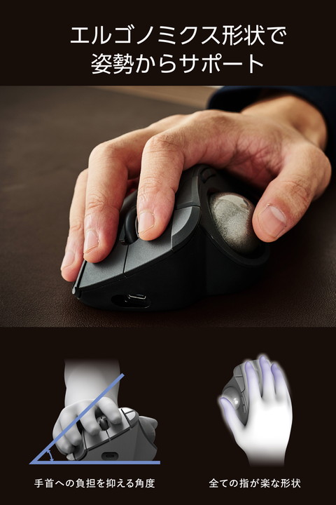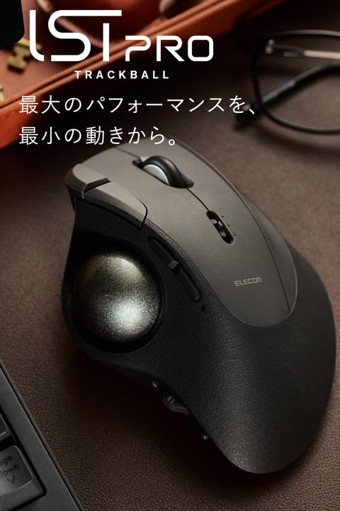 最大のパフォーマンスを、最小の動きから。親指トラックボールに搭載できる機能を極限まで追究した10ボタンのハイグレードモデル“IST PRO”です。握らず自然な手の形で使えるエルゴノミクスデザインと、なめらかな操球感を実現する高性能ベアリング支持ユニットを採用。長時間の使用でも負担がかかりにくい設計です。![]() ■親指トラックボールに搭載できる機能を極限まで追究した10ボタンのハイグレードモデル“IST PRO”です。 ■握らず自然な手の形で使えるエルゴノミクスデザインを採用。手の大きさや握り方を問わず手に馴染みます。 ■手首に負担のかからない角度の傾斜で、長時間の作業でも快適です。 ■ベアリング支持ユニットにはミネベアミツミ社製高性能ベアリングを採用。摩擦による抵抗が減るため、空中に浮いているような、なめらかな操球を実現しました。 ■ボール表面を擦らないので支持ユニットにゴミが集まりにくく、長期間メンテナンスフリーでご使用いただけます。 ■支持ユニットは簡単に取り外し可能で、ベアリングはもちろん人工ルビーにも交換可能です。 ■※交換用のベアリングユニット(M-BS10)および人工ルビーユニット(M-RS10)は別売です。 ■裏面の穴から簡単にボールを取り外し・交換が可能で、ボールや内部の支持ユニットのメンテナンスがしやすい設計です。 ■親指にフィットする直径36mm大型ボールを採用。一度の操作でポインターを広範囲かつ繊細に動かせます。 ■※交換用ボール(M-B10SV)は別売です。 ■左右・ミドルボタン、「進む」「戻る」ボタンに加え、3つのファンクションボタンとチルトホイールを備えた10ボタン仕様。右ボタン横のファンクションボタンで右手薬指でのアクションも可能です。 ■傾けるだけで横スクロールが可能なチルトホイールを搭載しています。 ホイールだけで上下左右にスクロールが可能で、ExcelやWebブラウザ使用時の作業効率が大幅に向上します。 ■専用の設定ソフト「エレコム マウスアシスタント」を使用することで、10ボタンそれぞれに好みの機能を割り当て可能。あらゆる方向の動きを無限に組み合わせ、多彩な操作を右手で完結できます。 ■トラックボール本体へ最大3パターンのプロファイルを保存可能。接続デバイスを切り替えても機能の割り当て設定を保持できます。 ■Bluetooth(R)無線、USB2.4GHz無線、USB有線での接続が可能。幅広いOSに対応し、WindowsやMacはもちろん、 Chromebook やiPad・iPhone、Android搭載タブレットなどにも接続できます。 ■最大6台まで接続デバイスを登録可能。パソコンやタブレット、スマートフォンなど、使用環境と接続機器に合わせて接続の仕方を自由に組み合わせられます。 ■※6台の内訳はBluetooth接続:2台、USB2.4GHz無線接続:1台、USB有線接続:1台、カスタム接続:2台 ■※カスタム接続はBluetooth接続かUSB2.4GHz無線接続を「エレコム マウスアシスタント」を使ってお選びいただけます。初期設定はBluetooth接続に設定されています。 ■※カスタム接続をUSB2.4GHz無線接続で使うには、別売のELECOM Bridge G1000 USB レシーバーの購入および「エレコム マウスアシスタント」での設定が必要です。 ■接続先切り替えダイヤルをトラックボール側面に搭載。本体から手を離さずに接続先を簡単に切り替えられます。(特許出願中) ■※USB2.4GHz無線接続を追加する際は、別売りのELECOM Bridge G1000 USB レシーバーの購入および「エレコム マウスアシスタント」での設定が必要です。 ■ポインターの速度をLow/Mid/Highの3段階から選択できます。初期設定は500/1000/1500DPI。「エレコム マウスアシスタント」から100〜12,000DPIまで100DPI刻みで設定を変えられます。 ■ELECOM Bridge G1000ワイヤレステクノロジーを搭載。ゲーミングセンサー(PixArt PAW3311DB)とハイグレードMCUにより、最大レポートレート1000Hzに対応し、ゲーミング用途にも耐えうる通信とトラッキング性能を実現しています。 ■左右ボタンには、パナソニック株式会社が開発した静音スイッチを採用。クリック感と耐久性を損なわず、高い静音性を実現しました。 ■左右以外のボタンにも静音タイプのスイッチを採用。会議中のパソコン操作や在宅勤務時の早朝・夜間の作業などでも周りを気にせず使用できます。 ■レシーバーは本体への収納が可能なため、紛失しにくく、持ち運びに便利です。 ■本体側面に電源スイッチがあり、本体を裏返さずスムーズな電源のON/OFFが可能です。不使用時の電池の消耗を防止できます。 ■USB有線接続、手軽に交換できる乾電池式、別売りのバッテリーパック使用の充電式と3パターンの電源を自由に選んで使えます。 ■※本製品にバッテリーパックは付属していません。別売のバッテリーパックを合わせてご使用ください。 ■※市販のニッケル水素充電池は使用できません。 ■Bluetooth接続した際に、パソコンから電池残量を確認できる機能を搭載しています。 ■電池交換時期と接続先等のステータスを表示するインジケーターを搭載しています。 ■