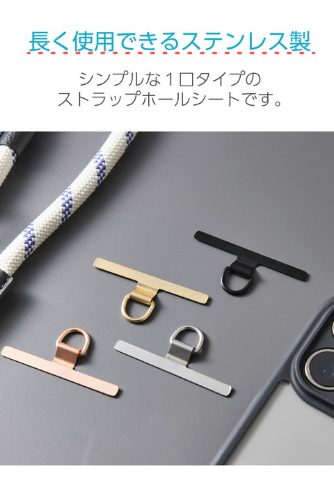 丈夫でちぎれにくい!スマートフォンとケースの間に挟むだけでストラップホールを追加できる、1口タイプのステンレスストラップホールシートです。お使いのスマートフォンケースのケーブル穴に通すだけで使用できます。ケースを変えても繰り返し使用でき、装着したままでもイヤホンや充電ケーブルの接続が可能です。