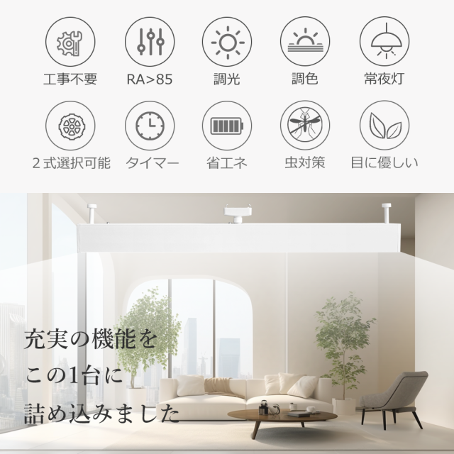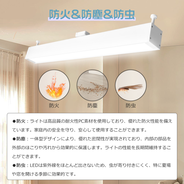 - ?長寿命:一度設置すれば、約10年間交換不要で、安心して長期間使用できます。(※寿命は光束が70%に低下するまでの時間です。表示は設計寿命であり、製品の寿命を保証するものではありません。) ?虫が寄りにくい設計:LEDは紫外線をほとんど出さないため、虫が寄り付きにくく、特に夏場や窓を開ける季節に効果的です。