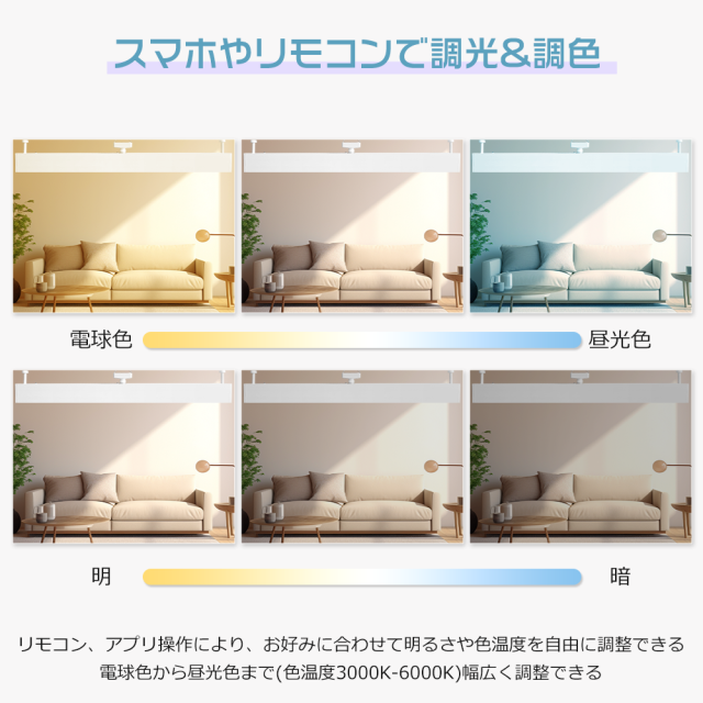 LEDシーリングライトは無段階調光調色機能を搭載されています。明るさは0から100%まで、色温度は電球色3000Kから昼光色6000Kまで調節できます。環境と雰囲気によってご希望な光度と色温度はご自由に調節できます。(*壁スイッチは調光調色機能には対応していません)