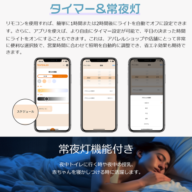 - リモコンの常夜灯ボタンを押すと、睡眠に適した柔らかな光を素早く作り出します。高齢者やお子様にも安全な環境を提供し、夜間に起きた際に適切な光を照らします。これにより、暗い中での移動が安心で、安全性を高めます。また、タイマー機能搭載で指定したい時間を設定すれば、自動的に点灯&消灯することができます。就寝前やお出かけ時に便利で、無駄な電力消費を防ぎます。