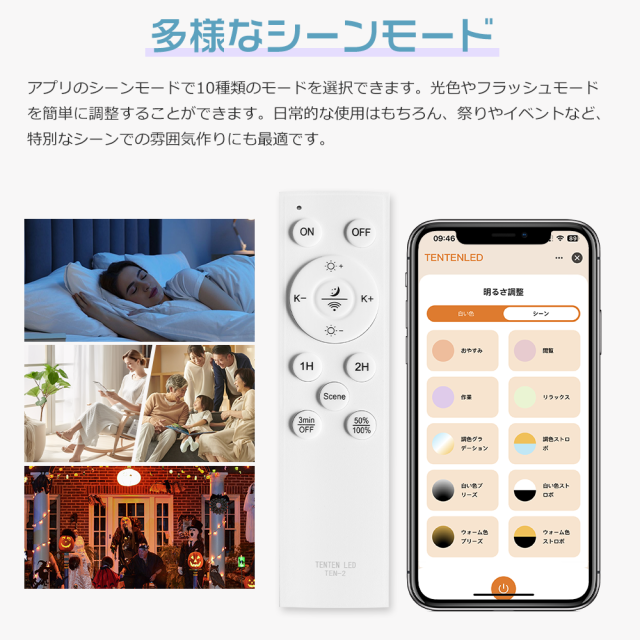 - おやすみ、閲覧、作業、リラックス、調色グラデーション、調色ストロボ、白い色ブリーズ、白い色ストロボ、ウォーム色ブリーズ、ウォーム色ストロボの10種類のシーンモードを自由に切り替えます。お好みや用途に合わせて光の色を変えることができます。。