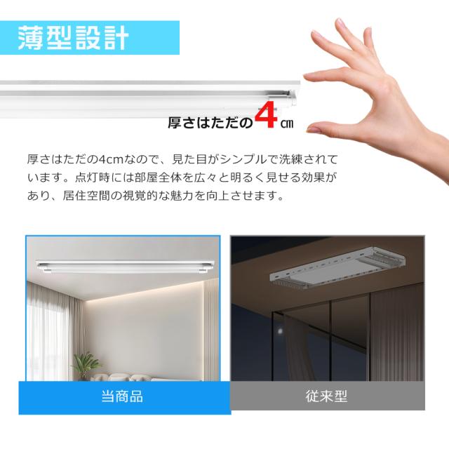 - 厚さはただの4cmなので、見た目がシンプルで洗練されています。点灯時には部屋全体を広々と明るく見せる効果があり、居住空間の視覚的な魅力を向上させます。