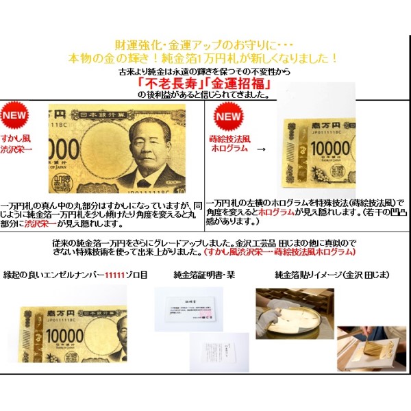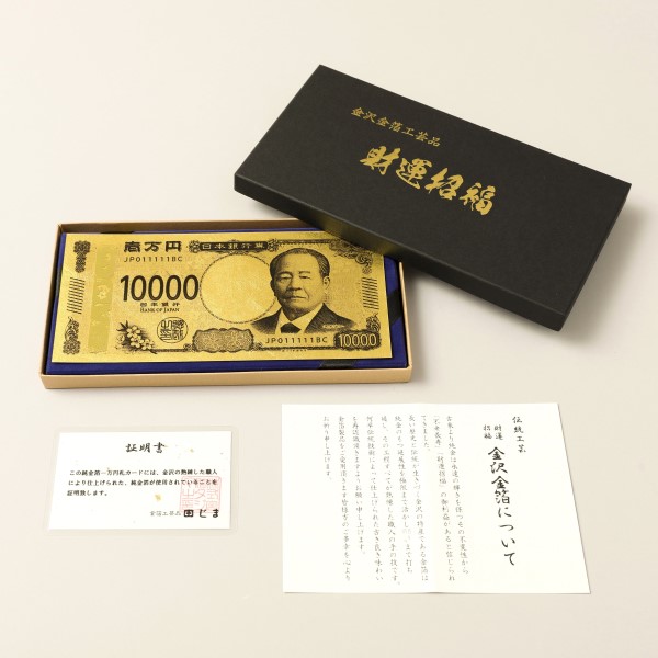 | セット内容 | 純金箔一万円札プレミアムカード1枚・純金箔証明書・しおり |
