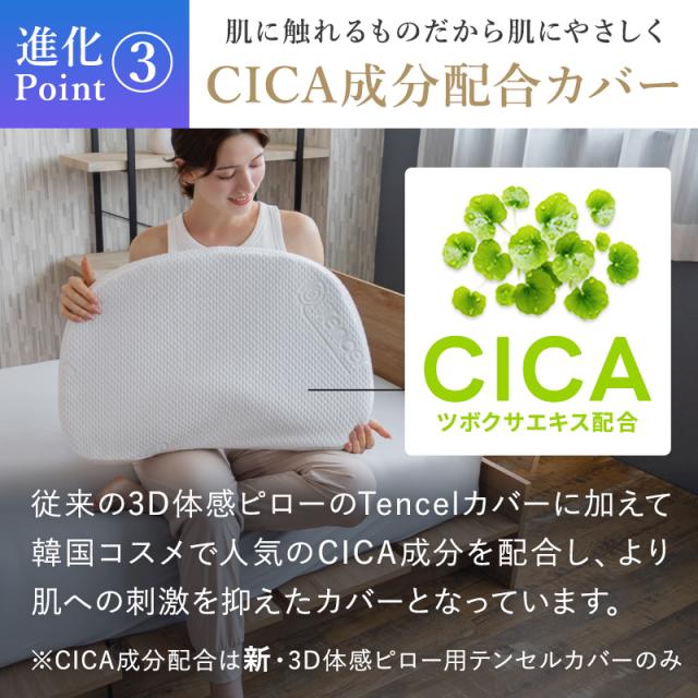 首肩に沿って支えるエルゴネック構造、高さを変えられる調整シート、肌に優しいCICA成分配合のカバーを採用した、進化した3D体感ピローです。
