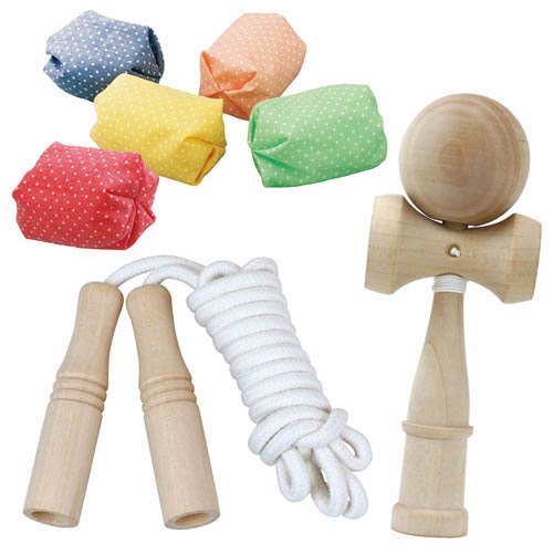 | ・木製けん玉(ヒモ付)、木柄なわとび、お手玉5色組 |