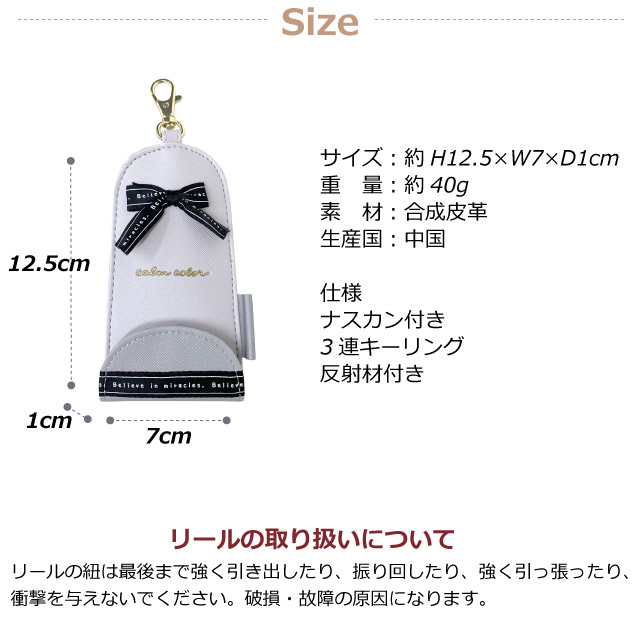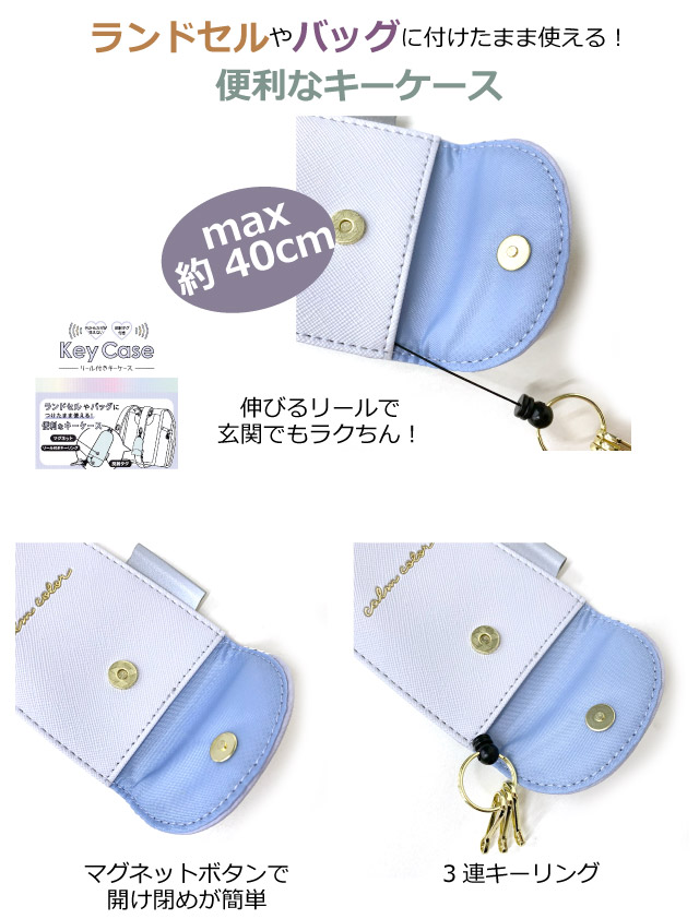 ![]() ![]() ![]() ![]() ・リボン 大きなリボンがかわいい小学生向けのリール付きキーケース。 ランドセルのショルダーベルトフックに引っかけて簡単取り付け。ランドセルを背負ったまま簡単に鍵が取り出せます。 リール付きなので鍵を紛失する心配もありません。 鍵は見えない設計になっていて防犯面も安心。 入学準備の定番アイテムとなりつつあります。 入学のお祝いやプチギフトとしてプレゼントするのも喜ばれること間違いなし。
