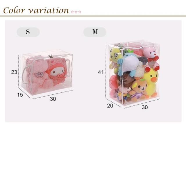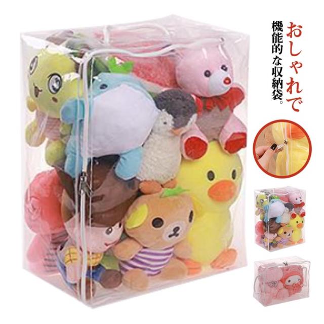 | おしゃれで機能的な収納袋。 透明の素材なので、おしゃれに収納でき、ファスナーを開けずに中身の確認が簡単にできます。 取っ手付きで、取り出しやすく、持ち運びしやすいです。 置き場所に困ったぬいぐるみの収納に最適です。 ぬいぐるみはもちろん、バッグ、ストール、マフラー、ベルトなどのファッション小物を入れておくのにもオススメ。 | |