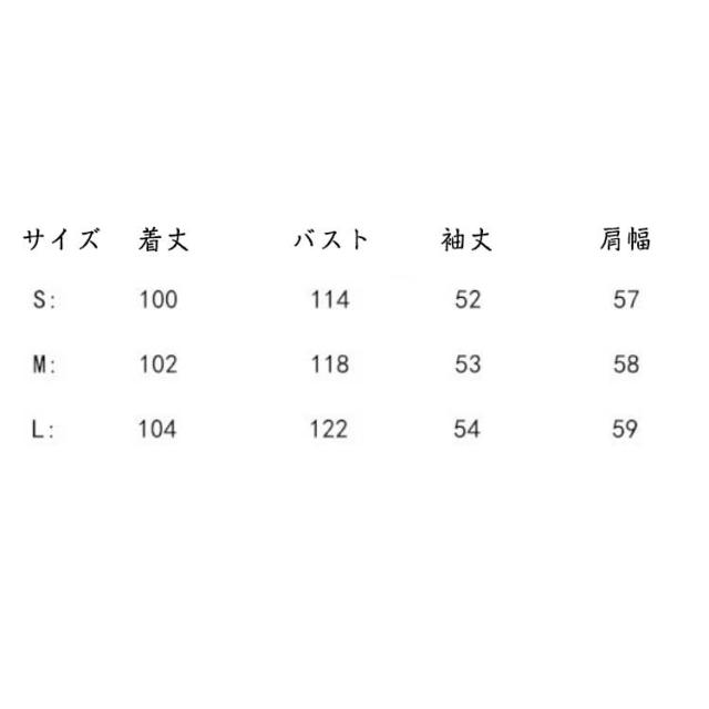 | サイズについての説明 | S:着丈100cm バスト114cm 袖丈52cm 肩幅57cm/ M:着丈102cm バスト118cm 袖丈53cm 肩幅58cm/ L:着丈104cm バスト122cm 袖丈54cm 肩幅59cm/ ※サイズ表の実寸法は商品によって1-3cm程度の誤差がある場合がございます。 |