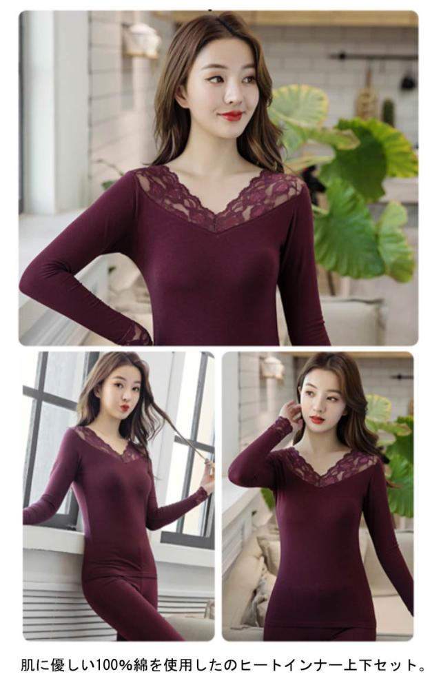 長袖インナー 長袖 おしゃれ ロンt tシャツ Vネック ヒートテック 春 レース付き カットソー 肌着 スパッツ 上下 100%綿 インナー レギンス ヒートテック セットアップ ストレッチ レディース 秋冬 肌に優しい 柔らかい 薄手 発熱 保温 防寒 毛玉防止 レイヤード