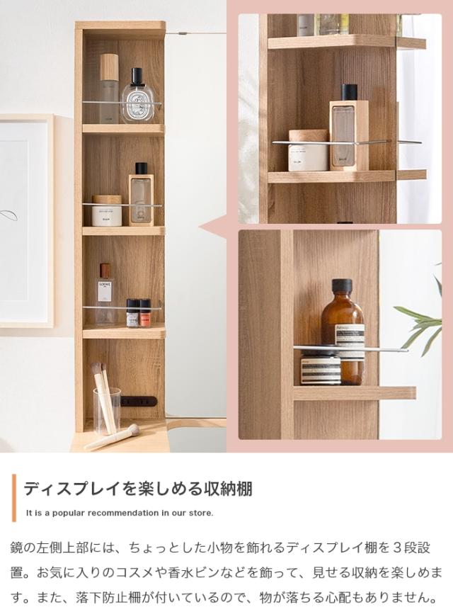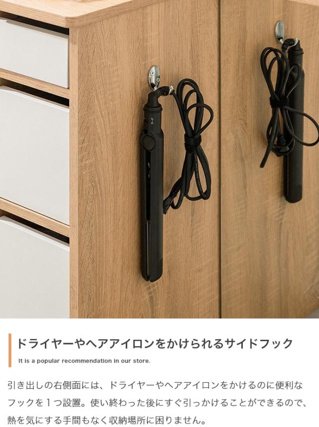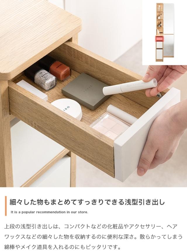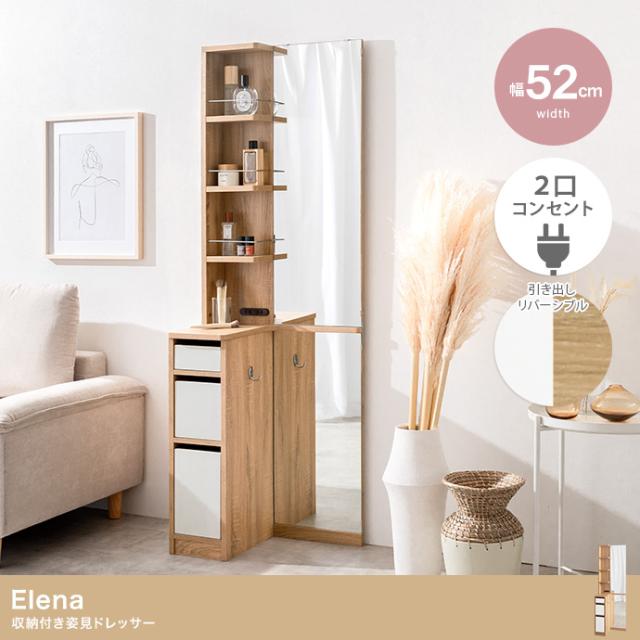 | 説明 | 足元までしっかり映り、1台で2通りのカラーを楽しめる『Elena(エレナ)』収納付き姿見ドレッサー。全身が映る大きな鏡と大容量の収納スペースはヘアセットやメイクアップを効率よく進めることができ、毎日の忙しい朝にもピッタリ。また、コンパクトでスリムな設計なので、1人暮らしやワンルームにも置きやすくなっています。 |