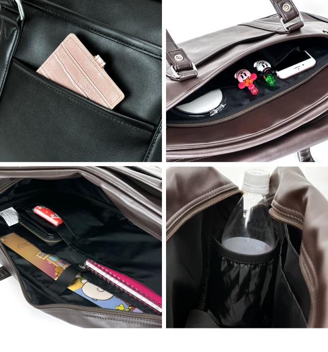 | サイズ | サイズ:約W43×H25×D15cm 重量:約670g 素材:合成皮革 カラー:ブラック×レッド、ブラック×グレー、ブラック×ベージュ、チョコ×レッド、チョコ×チョコ、チョコ×ベージュ 外側:オープンポケット×1、ファスナーポケット×1(内側:ペンポケット×2、オープンポケット×2) 内側:ボタン付きポケット×1、オープンポケット×3、ペットボトルポケット×1 |