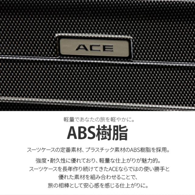 | 〜 限定商品 ACE 「REFLECTION」 series 〜 100Lの大容量スーツケース。10泊以上のご旅行にお勧め。安定走行できる双輪キャスターを採用。無料受託手荷物規定内最大サイズです。 ・カーボン調で、落ち着いた大人デザインで ビジネスシーン・スーツの移動の際も持ちやすい。 ・光沢感のある美しい外面が特長的。 ・高硬度で耐衝撃性に優れ、出張や旅行にも安心の耐久性。 ・キャリーハンドルはアルミ製で、スライド調整式。 身長や持ち運びシーンに応じて、ワンタッチで調整も可能。 開閉はファスナータイプ。「TRAVEL SENTRY ダイヤルファスナーロック(TSAロック)」を搭載しています。破損しにくいボディ埋め込み式を採用し、ダイヤル式なのでキーを持ち歩く煩わしさも、紛失の心配もありません。(※本製品にはキーは付属しておりません。スライドロックの鍵穴はTSA職員が検査する際に使用するものです) |