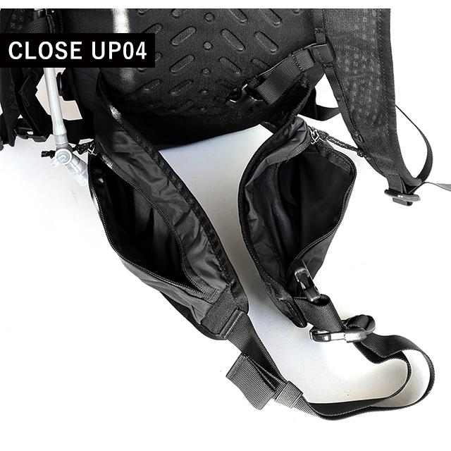 | 仕様 | 開閉:ファスナー式 外部収納:ファスナーポケット×2、サイドポケット×2 内部収納:キークリップ×1 サングラスポケット×1 専用スリーブに入れられる2リットルのハイドラパック製給水パック付き 容量:20L |