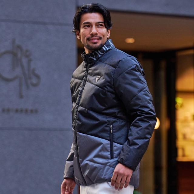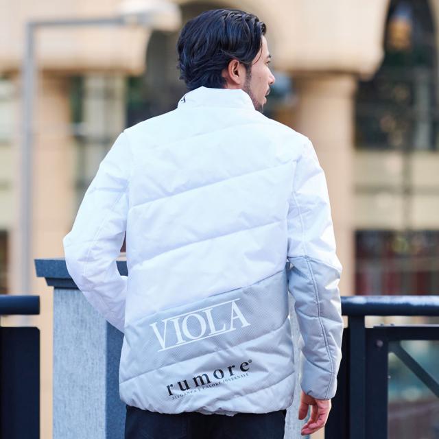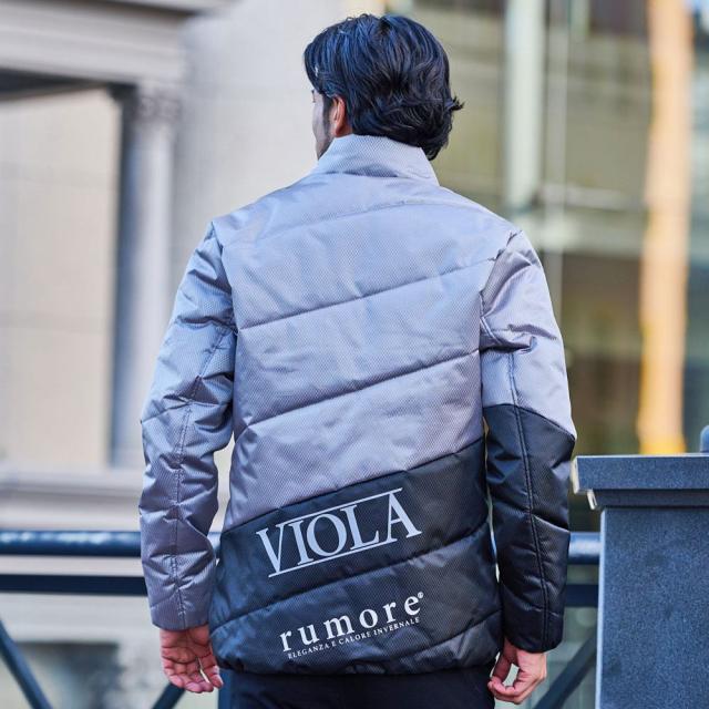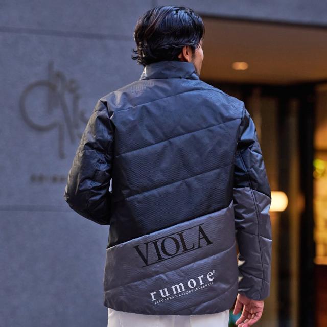 都会的でスタイリッシュなスランティングキルティングデザインと、程よい光沢感のある素材が上品さを引き立て、背面とフード部分には大胆に配置された「VIOLA RUMORE」のロゴが洗練された印象を与えます。