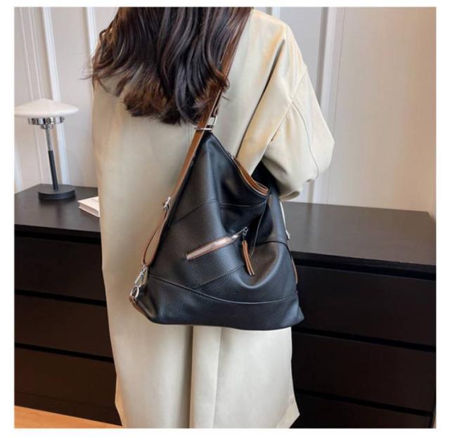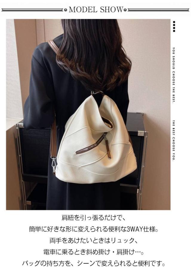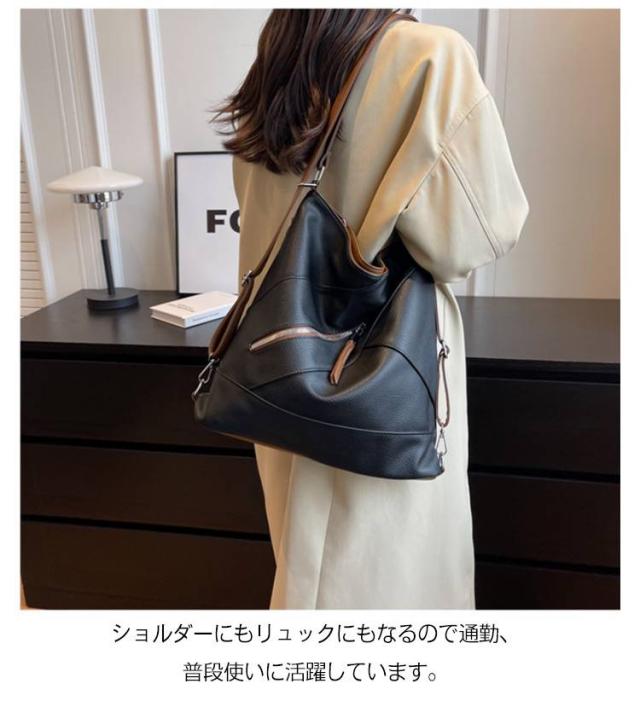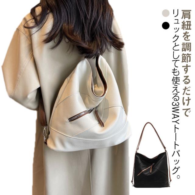 | 肩紐を調節するだけでリュックとしても使える3WAYトートバッグ。 肩紐を引っ張るだけで、簡単に好きな形に変えられる便利な3WAY仕様。両手をあけたいときはリュック、電車に乗るとき斜め掛け・肩掛け…。バッグの持ち方を、シーンで変えられると便利です。 表地は水と汚れを弾く撥水PUレザー生地を使用しているため、お手入れしやすいです。 書類や長財布、ペットボトル、スマホなどが入れられる通勤にも使いやすいサイズ感。 フロントファスナーポケットはスマホが入るサイズ ショルダーにもリュックにもなるので通勤、普段使いに活躍しています。 | |