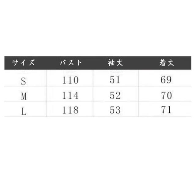 | サイズについての説明 | S:バスト110cm 袖丈51cm 着丈69cm/ M:バスト114cm 袖丈52cm 着丈70cm/ L:バスト118cm 袖丈53cm 着丈71cm/ ※サイズ表の実寸法は商品によって1-3cm程度の誤差がある場合がございます。 |