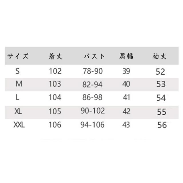 | サイズについての説明 | S:着丈102cm バスト78-90cm 肩幅39cm 袖丈52cm/ M:着丈103cm バスト82-94cm 肩幅40cm 袖丈53cm/ L:着丈104cm バスト86-98cm 肩幅41cm 袖丈54cm/ XL:着丈105cm バスト90-102cm 肩幅42cm 袖丈55cm/ 2XL:着丈106cm バスト94-106cm 肩幅43cm 袖丈56cm/ ※サイズ表の実寸法は商品によって1-3cm程度の誤差がある場合がございます。 |