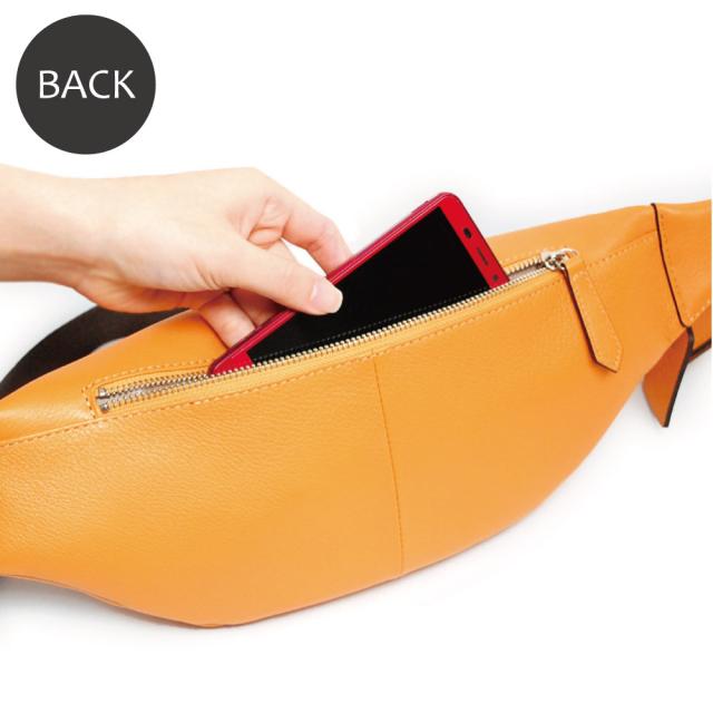 カラフルなオリーブレザーを使用した、三日月のフォルムが特徴的なボディバッグです。小ぶりに見えますが、長財布やスマートフォン、文庫本などをいれても余裕があり、おでかけにおすすめです。 体に当たる部分がやや丸みを帯びているためフィットしやすく、歩くたびにバッグが振られる心配もありません。また、ベルトストラップは長さを自由に調整できるのでゆったり持つこともできます。背面のファスナーポケットはスマートフォンが簡単に出し入れきるよう、位置を高めに設定しました。カラーは全9色。男女問わず使えるジェンダーレスな色と形のボディバッグに仕上がっています。