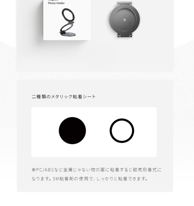 さらに、二種類のメタリック粘着シートが付いており、PC/ABSなど金属じゃない物の面に粘着すると磁気吸着式になります。3M粘着剤の使用で、しっかりと粘着できます。