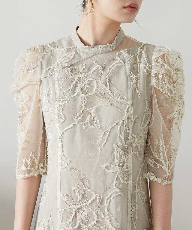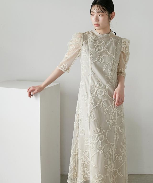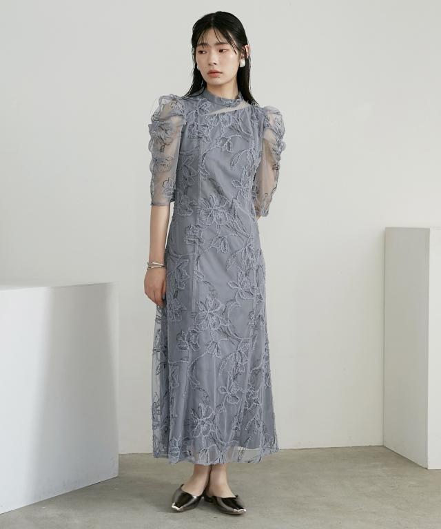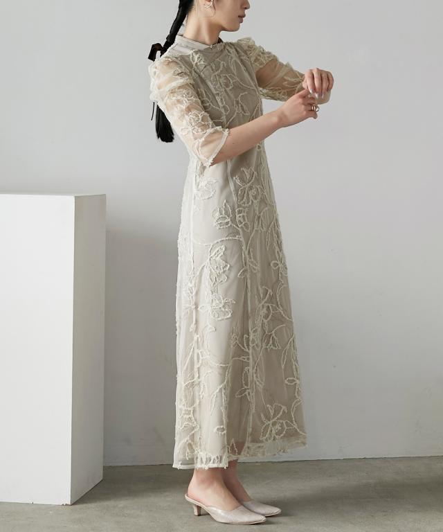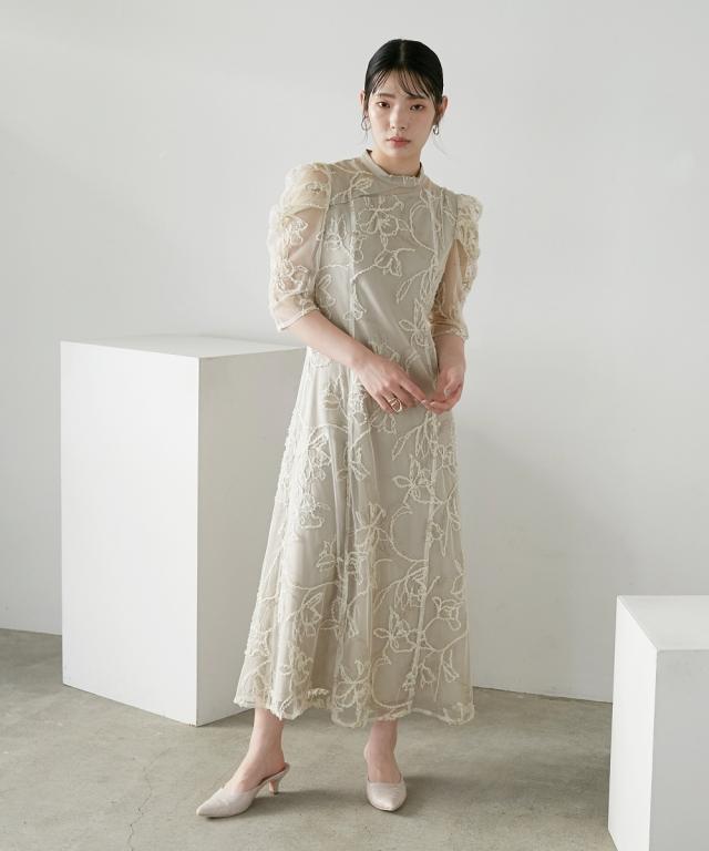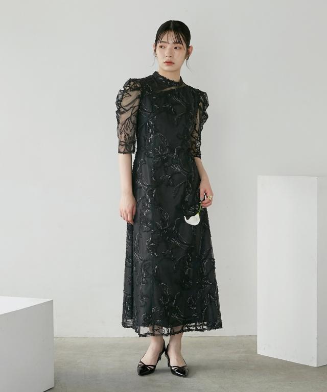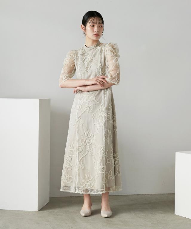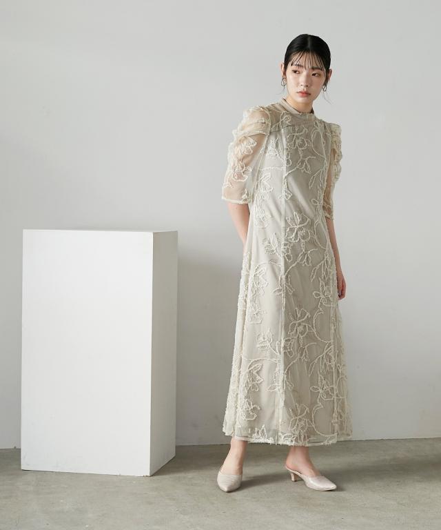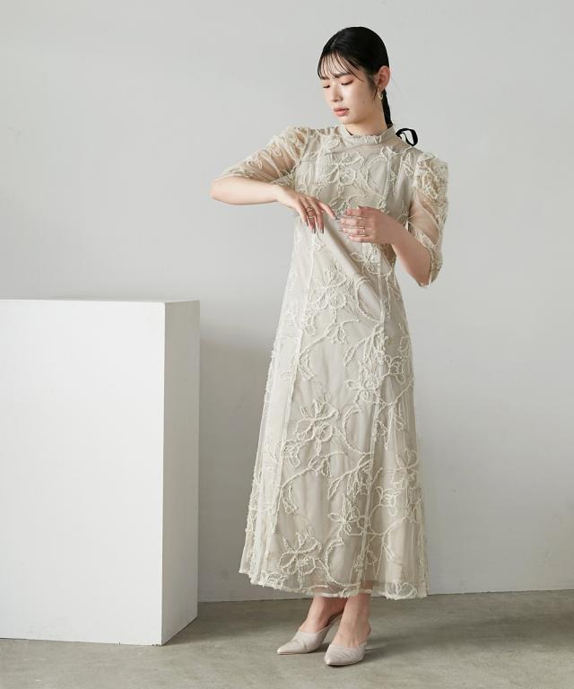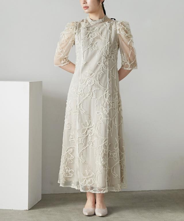 【結婚式・お呼ばれ・パーティー・オケージョンドレス】カッティング風フリンジ刺繍ロング丈ワンピースドレス 〔Callarus〕