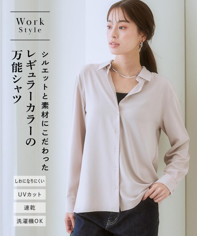 【機能生地で仕立てたシンプルデザインのシャツ】スーツによく合い、1枚でもきれいに着こなせるこだわり設計。毎日のオフィススタイルに重宝します。 ■ポイント ・滑らかでとろみのあるトレッチパウダーサテンシリーズ。 ・何気ないのに美しいシルエットが女性らしさを引き立てる、こだわりのシャツ。 ・お値頃な価格も 。 ■デザイン ・シルエットと素材にこだわったレギュラーカラーのシンプルな万能シャツ。 ・1枚でもジャケットインでも着用しやすいややゆとりのあるシルエット。 ・背中の丸みをほんのりカバーする後ろタック入り。 ■素材 ・働く女性の毎日をサポートする「しわになりにくい、速乾、洗濯機OK、UVカット」の優秀機能素材。 ・光沢感とストレッチ感のあるパウダーサテン生地。 ・UVカット機能付き。 ■おすすめのスタイリング ・ジャケットインスタイルでも1枚でも映えるおすすめアイテム。 〜7days Life Styling〜 仕事の日、休日、イベントの日まで、 働く女性の毎日を商品やコンテンツを通して、 自分らしく快適でいられる働く服改革をサポートします。