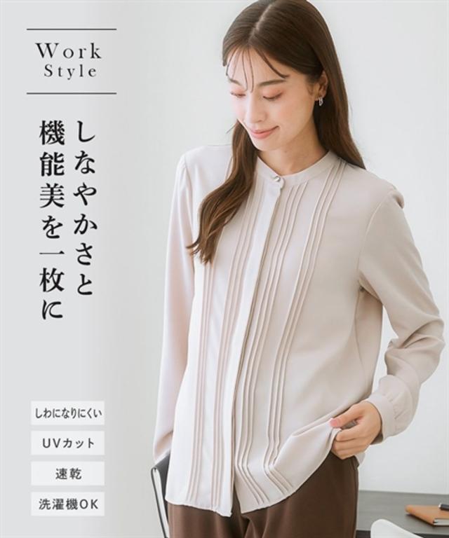 ストレッチパウダーサテンピンタックブラウス(しわになりにくい・速乾・洗濯機OK・UVカット)