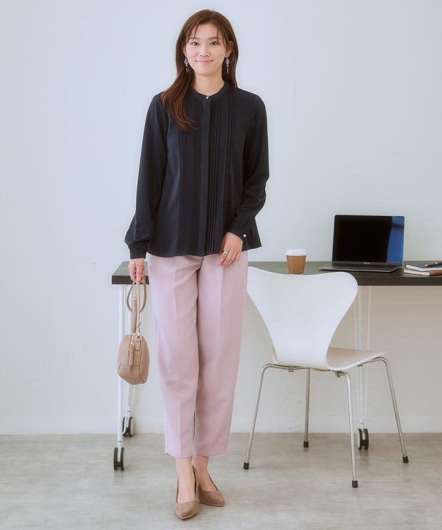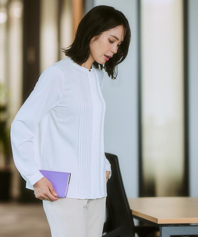 【繊細なピンタックが美しいブラウス】控えめな一粒ボタンがかえっておしゃれな存在感に。上品さが欲しい日に選んで。 ■ポイント ・滑らかでとろみのあるトレッチパウダーサテンシリーズのピンタックブラウス。 ・オフィスモニターさんも太鼓判。 ■デザイン ・繊細なピンタックが大人っぽい雰囲気を醸し出すシンプルデザイン。 ・バンドカラーにメタルボタンがポイント。 ■素材 ・働く女性の毎日をサポートする「しわになりにくい、速乾、洗濯機OK、UVカット」の優秀機能素材。 ・光沢感とストレッチ感のあるパウダーサテン生地。 ・UVカット機能付き。 ■おすすめのスタイリング ・ウエストをインしてスカートと合わせればデイリーなオフィススタイルが完成。 ・ややカジュアルなボトムもよく似合うのでオフスタイルにも重宝。 〜7days Life Styling〜 仕事の日、休日、イベントの日まで、 働く女性の毎日を商品やコンテンツを通して、 自分らしく快適でいられる“働く服改革”をサポートします。