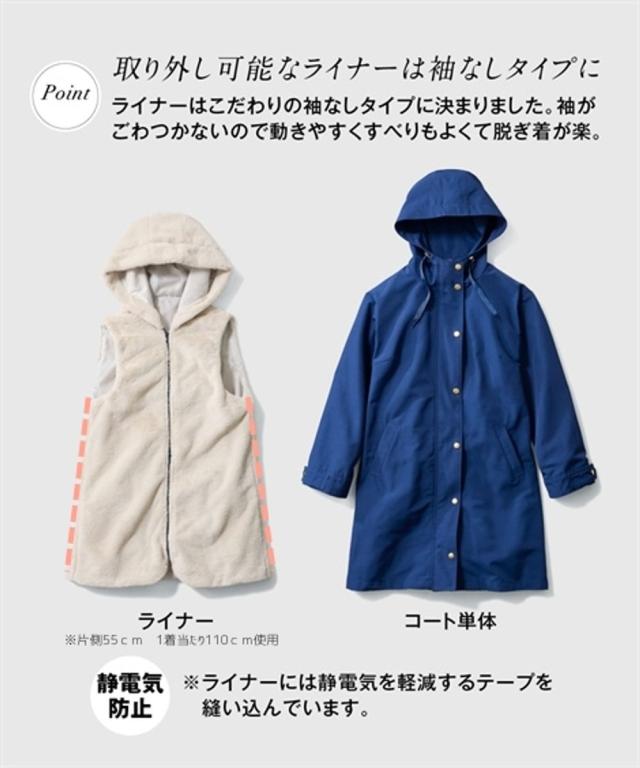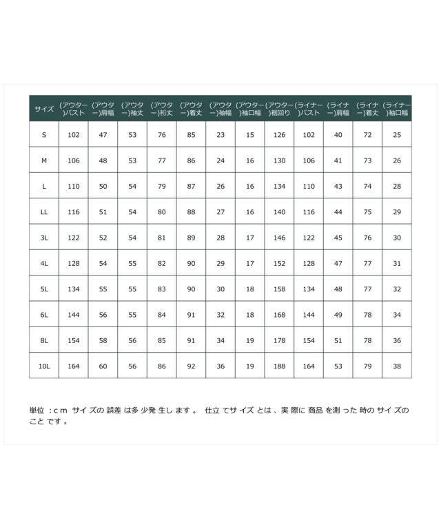 品質=[本体・ライナー]ポリエステル100% [裏地]有(本体袖部) 前ファスナー 前ボタン開き 袖部ボタン調整可 ポケット両脇 ライナーは取り外しできます。 透け感:なし 伸縮性:なし 生地の厚み:普通 光沢感:なし 裏地:あり ポケット:あり 季節:春・秋・冬(ライナーのお取り外しで調整できます) シルエット:ややゆったり 原産国:中国製(企画デザインは日本) 備考:手洗い ※単位:cm ※サイズの誤差は多少発生します。 ※仕立てサイズとは、実際に商品を測った時のサイズのことです。